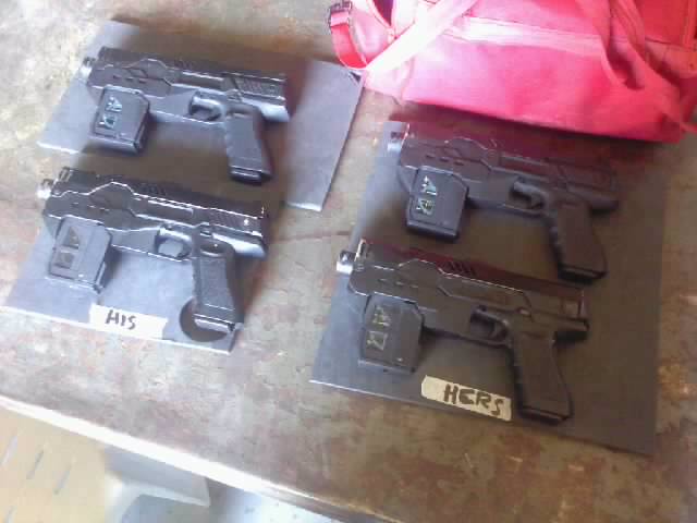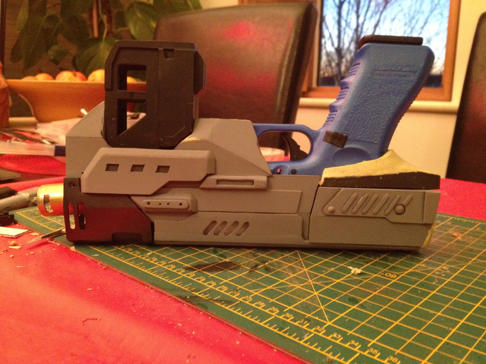 As I had designed it all in photoshop to realise it in 3D with tops, bottoms and back and front was quite a challenge and I had many failed attempts at heating and bending the styrene to give the squareish curvature of the top section...let alone the bottom shape..but more on that later...I finally, after hunting high and low for the correct length and width, settled on the spine of an old Illustators agency catalogue..haha! it was damn near perfect to bring the flat parts to glorious 3D life...and from there it went full throttle...I also decided to make it a firing prop an acquired another replica Glock but this time, for a few extra ££'s, got an automatic gas powered BB gun to replace the rapidly deteriorating through glue and scalpel cuts springer.