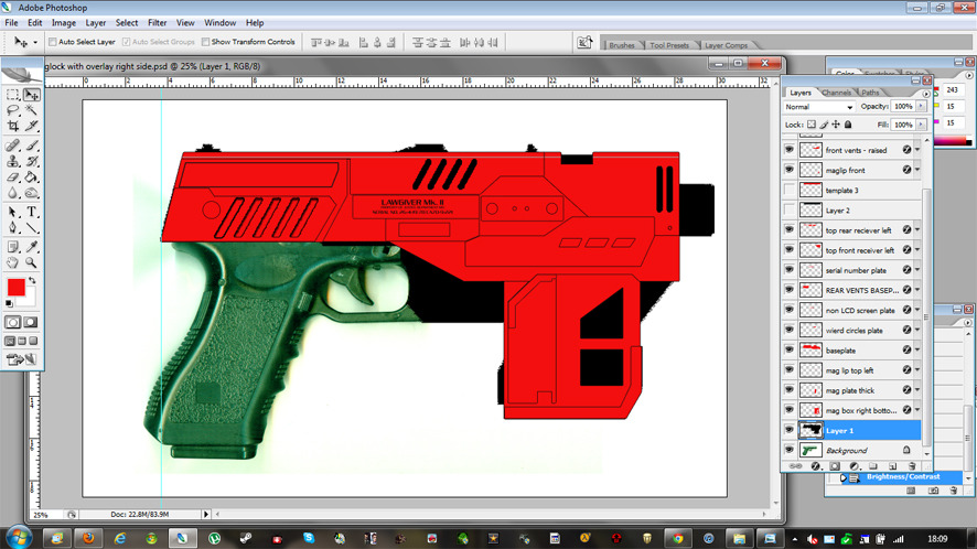 It just so happened that I had a cheap spring powered replica to begin making templates over..so it was straight to photoshop. Here's my first, rather simple, attempt at drawing them up in photoshop way back in early September.
